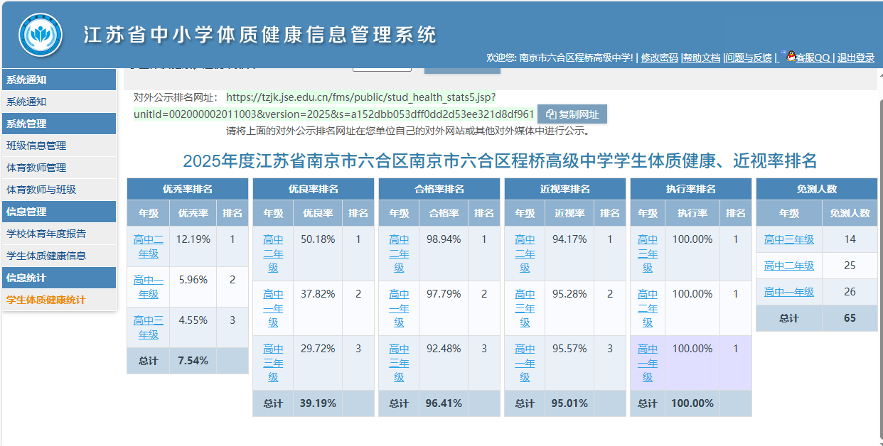 2025年度江苏省南京市六合区程桥高级中学学生体质健康、近视率排名