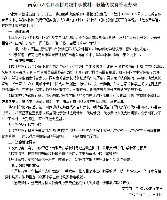 南京市六合区程桥高级中学教材、教辅代收费管理办法