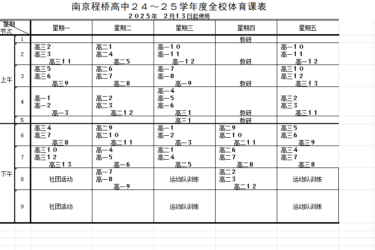 南京市2024-2025学年度第二学期程桥高级中学体育总课表